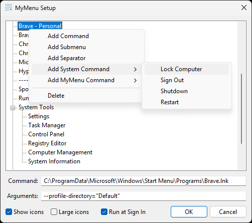to edit the name. The Setup and Close options can be removed as they are also available from the MyMenu system tray icon.
